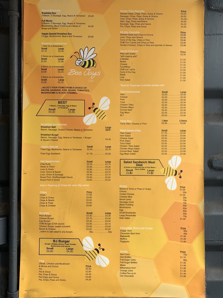 The Bee Jay's Cafe Menu offers a variety of tasty options that cater to all tastes. From hearty breakfasts to satisfying lunches, there’s something for everyone. The café's breakfast options are particularly popular, with a great selection of classic British items like the Full English Breakfast, which comes with eggs, bacon, sausages, beans, and toast. Each dish is prepared fresh, ensuring high-quality meals that taste just as good as they look.